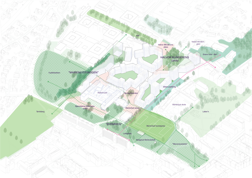En bypark på størrelse med St. Hanshaugen vil bre seg fra Blindern til NRK-parken og videre til Marienlyst idrettspark. Dette grønne båndet vil bli en naturlig oase midt i byen, hvor eksisterende trær og vegetasjon ikke bare bevares, men også løftes frem som hovedattraksjoner langs fredelige stier.
