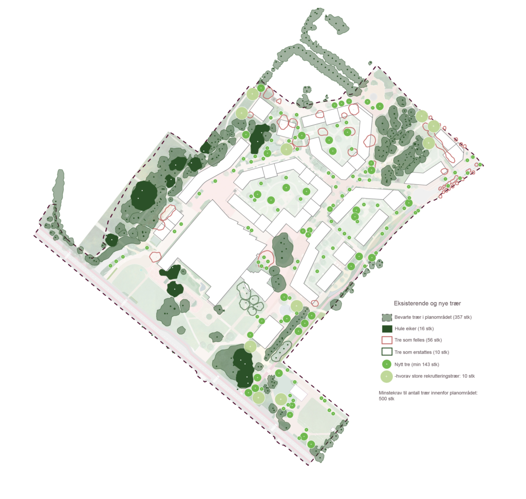 Marienlyst har i dag mange grønne kvaliteter, blant annet en høy tetthet av gamle edelløvtrær. Disse skal i størst mulig grad bevares og styrkes. Innenfor planområdet finnes det i dag om lag 400 trær, og for å videreføre områdets grønne preg stilles det krav om at det til enhver tid skal være minimum 500 trær.